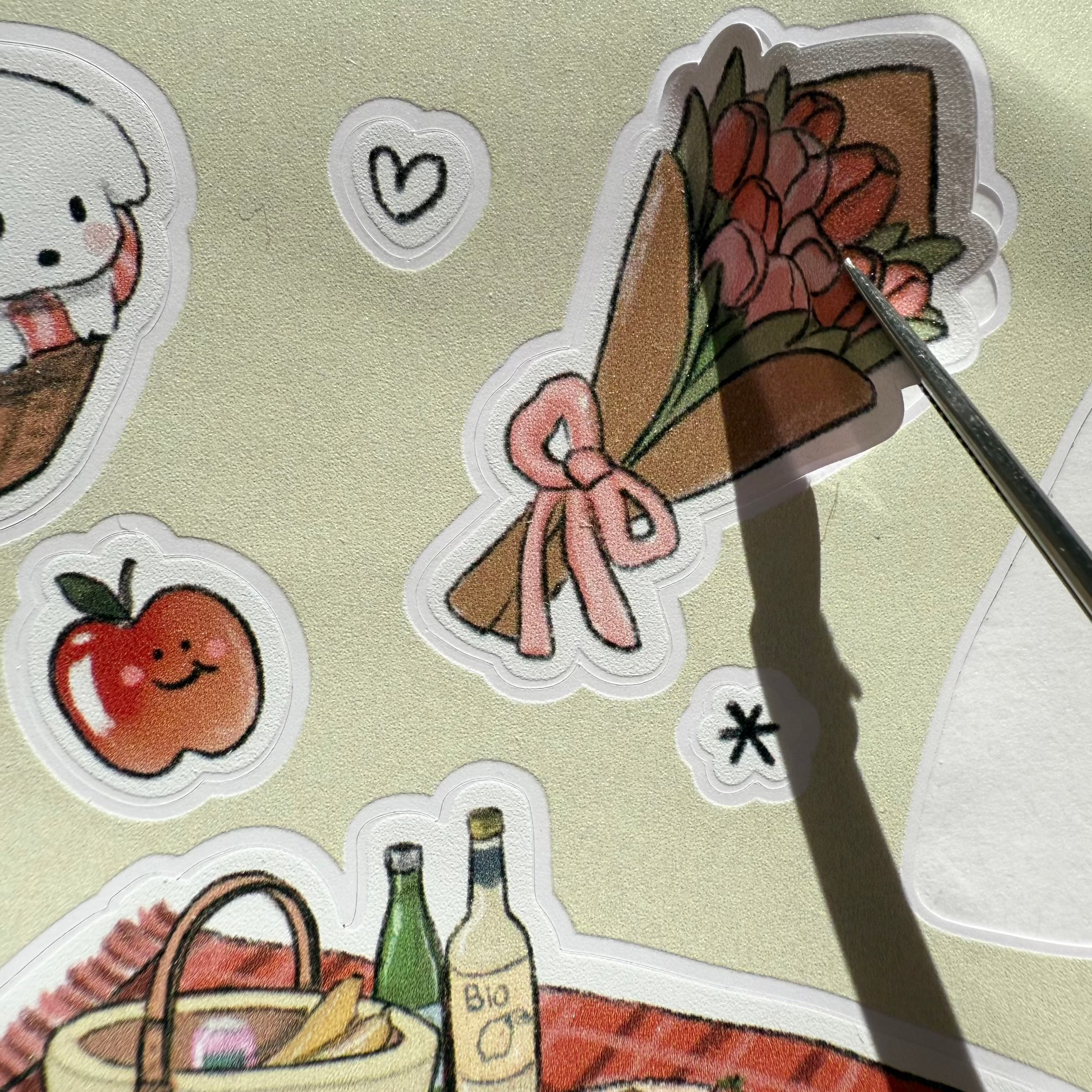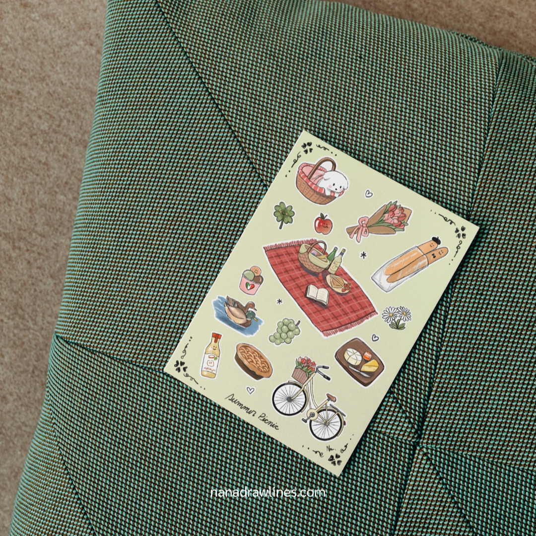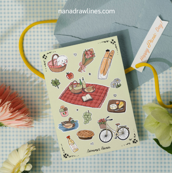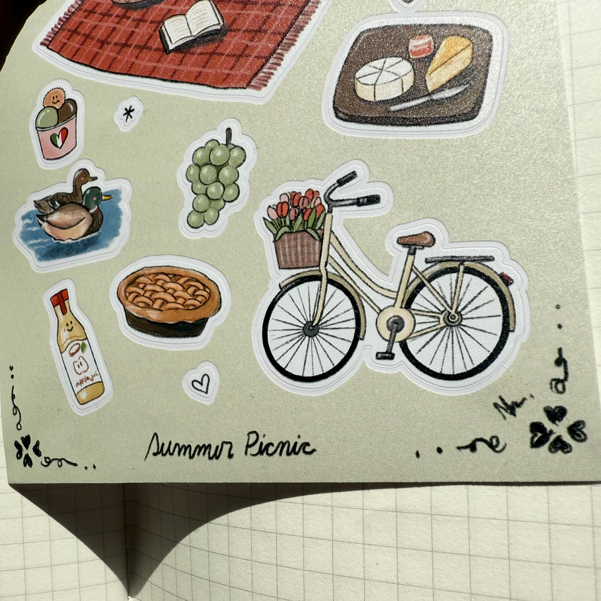 Bring the breezy joy of a summer picnic to life with this charming hand-drawn sticker. Featuring a little French flair – a fresh baguette, creamy gelato, homemade apple pie, and a vintage bicycle – it’s your perfect sunny day escape in sticker form. 🧺